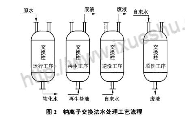 針對(duì)上述問題,采取了下列解決辦法引入去除了鈣鎂離子的軟化水來冷卻中頻爐。常用的水處理工藝是鈉離子交換法見圖,其原理是用樹脂中的鈉離子將水中容易結(jié)垢的鈣鎂離子置換出來,減少結(jié)垢,提高換熱效率。用酸洗劑加緩蝕劑清洗中頻爐線圈、管路和噴淋架,去除水垢。檢修水泵、閥門和管路,治理泄漏。