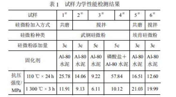 表1是以不同種類、不同添加量的硅微粉為結(jié)合劑和以磷酸鹽、Al-80水泥為固化劑的澆注料力學(xué)性能檢測(cè)結(jié)果。由表1可見,硅微粉的種類、加入方式、添加量以及固化劑種類對(duì)試樣的力學(xué)性能影響較大。由1#、2#試樣和5#、6#試樣的檢測(cè)結(jié)果可見,與硅微粉的直接攪拌加入方式相比,共磨加入方式能明顯改善澆注料的力學(xué)性能。由3#、4#試樣的檢測(cè)結(jié)果可見,固化劑種類對(duì)澆注料性能影響較大,并可看出磷酸鹽與Al-80水泥組成的復(fù)合固化劑具有明顯改善修補(bǔ)料性能的效果,而Al-80水泥則效果不明顯。由2#、3#試樣的檢測(cè)結(jié)果可見,硅微粉添加量的提高未能提高澆注料的力學(xué)性能。由采用相同的加入方式而硅微粉來源不同的1#、5#和2#、6#試樣的檢測(cè)結(jié)果可見,??瞎栉⒎叟c武鋼硅微粉相比,能明顯改善澆注料熱處理后的力學(xué)性能,并且添加埃肯硅微粉的澆注料抗壓強(qiáng)度隨試樣的熱處理溫度的提高而不斷增大。綜合可見,宜采用埃肯硅微粉作為鎂質(zhì)澆注料的結(jié)合劑,合適的添加量應(yīng)為3c%左右。