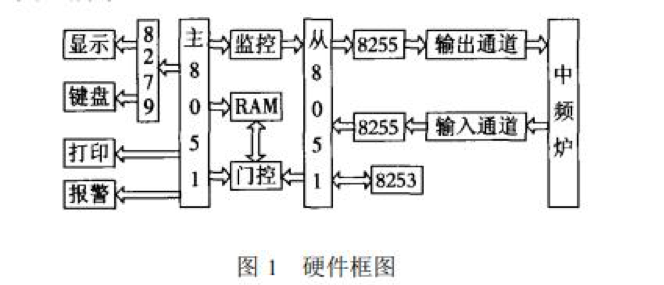 本系統(tǒng)是以 2 片 8051 單片機外圍接口電路構(gòu) 成的一個主從式雙工中頻電爐爐溫控系統(tǒng) ,硬件總體框圖如 圖 1 所示。