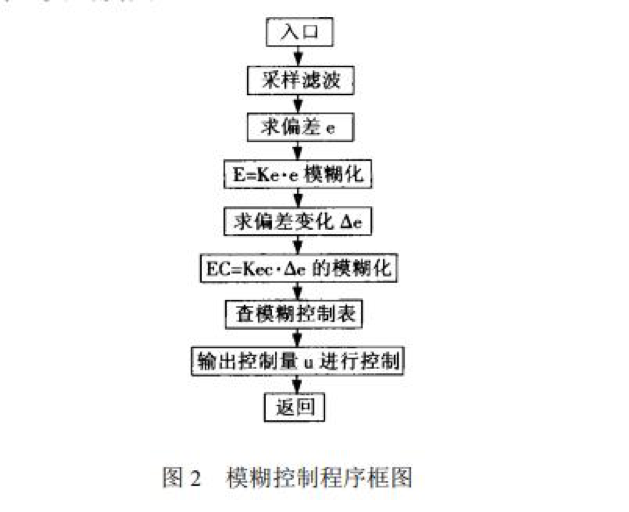 中頻爐溫度的模糊控制器是模糊控制系統(tǒng)的核心 ,它是一 種利用專家知識和操作者經(jīng)驗設(shè)計的專家控制系 統(tǒng) ,設(shè)計時不用數(shù)學(xué)解析模型來描述受控系統(tǒng)的 特性。在本溫度控制系統(tǒng)設(shè)計中 ,采用二維模糊 控制器 ,即以偏差 e 和偏差變化率Δe 作為模糊控制器的輸入變量 ,把加熱操作量作為輸出變量。 在模糊控制過程中 ,同時把偏差和偏差的變化率 作為模糊輸入量 ,這種方法不僅能保證系統(tǒng)控制 的穩(wěn)定性 ,而且還可減少超調(diào)量和振蕩現(xiàn)象。根 據(jù)受控系統(tǒng)的實際情況 ,確定輸入變量的測量范 圍和輸出變量的控制作用范圍 ,以確定每個變量 的論域 , Ke、Kec 和 Ku 分別為輸入和輸出變量的 量化因子和比例因子。先經(jīng)限幅處理 ,再經(jīng)量化 處理就得到了 E 和 EC。根據(jù)當(dāng)前已求得的 E 和 EC ,直接查詢模糊控制表就獲得控制量的變化值 ΔU ,將該變化值ΔU 乘以比例因子 Ku ,即可得到 當(dāng)前的實際控制量增量Δu。再將該增量和前一采 樣時刻的實際控制量相加 ,就得到目前應(yīng)實施的 控制動作 ,即 uk = uk - 1 + Ku ·ΔU ,其模糊控制 程序框圖如圖 2 所示。