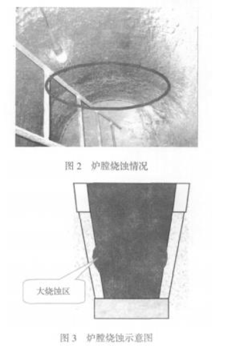 2009 年 2 月,我們與一家知名的爐襯材料供應(yīng) 商共同按照我們提出的性能要求選擇了一種爐襯材 料并進(jìn)行首次工藝試驗(yàn)。首次試驗(yàn)爐襯壽命為 40 爐次,未達(dá)到 預(yù)期要求。分析原因?yàn)闋t膛中下部局部燒蝕 過大造成失效,如圖 2、圖 3 所示。 從試驗(yàn)后拆爐過程看,爐襯整體未發(fā)現(xiàn) 有大的裂紋和崩裂。這說明這種爐襯材料產(chǎn) 生裂紋的傾向性很小,安全性較好。爐襯的 上部和爐底損壞較小;但是在爐身中下部, 爐身 1/3 高度上有明顯的較大燒蝕區(qū).